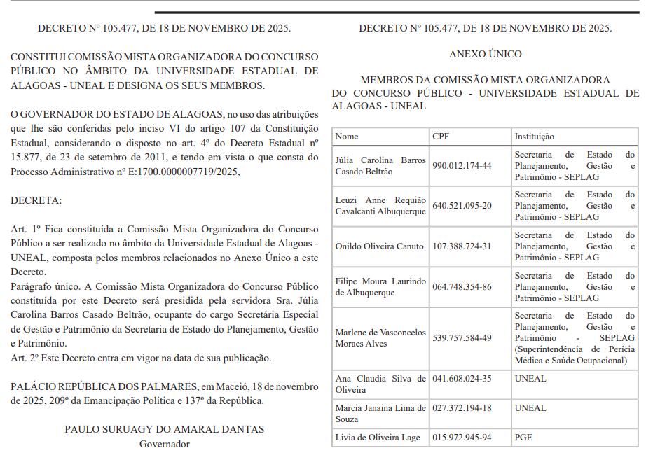 O Governo de Alagoas publicou o Decreto nº 105.477/2025, que constitui a Comissão Organizadora do concurso da UNEAL. A comissão será presidida por Júlia Carolina Barros Casado Beltrão (SEPLAG) e conta com representantes da SEPLAG, UNEAL e PGE. A partir de agora, começam os trâmites para elaboração do edital.