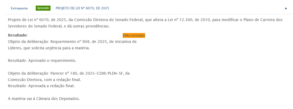O Senado Federal aprovou, nesta terça-feira (2), o requerimento de urgência e a redação final do Projeto de Lei (PL) nº 6.070/2025, que modifica o Plano de Carreira dos Servidores do Senado.